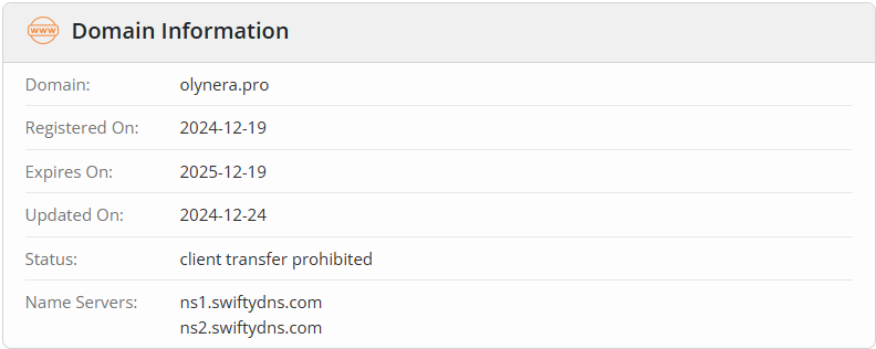 Домен сайта Olynera pro зарегистрирован в декабре 2024 года, проект существует чуть больше двух месяцев, данные на февраль 2025 г. Это ставит под сомнение утверждения о том, что организация существует с 2017 года.