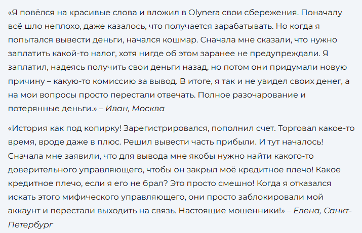 После оценки проекта «ОлинЕра» у нас возникло несколько подозрений по поводу возможного развода клиентов. На это указывает ряд фактов, включая отзывы клиентов.