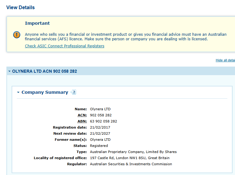 На сайте брокера указан юридический адрес, офис базируется в Лондоне, о владельцах и руководителях сведений не имеется. В качестве контактных данных представлен номер телефона и адрес электронной почты SupportOlynera pro, ссылки на страницы в социальных сетях не указаны.