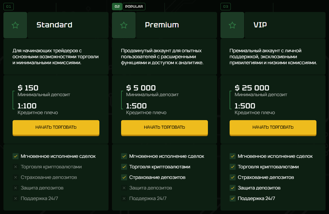 Для трейдинга потребуется регистрация аккаунта, после чего предоставляется возможность выбора одного из трех вариантов тарифов, они называются Standard, Premium и VIP. Терминал расположен на домене Olyn era info, клиентам предлагают инструменты для анализа и графики, гарантируется высокая скорость исполнения ордеров.