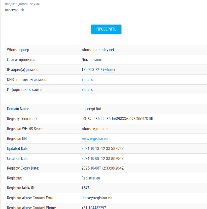 Сайт компании зарегистрирован в октябре 2024 года. Onecrypt telegram канал был создан в конце октября 2024 года.