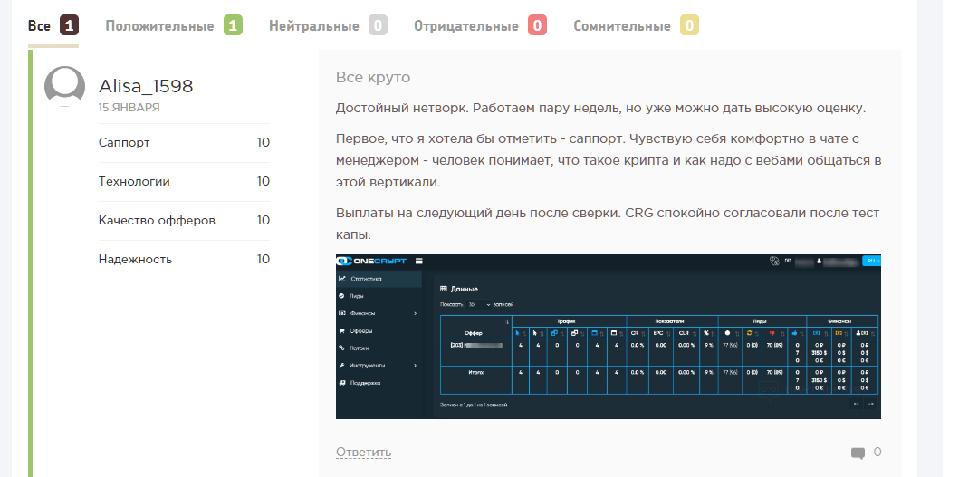 Об этой партнерской программе заработка на арбитраже практически ничего не известно. Про работу с onecrypt отзывы пользователей найдены в минимальном количестве, всего один.Проверка домена, официальной регистрации компании, анализ накрутки трафика