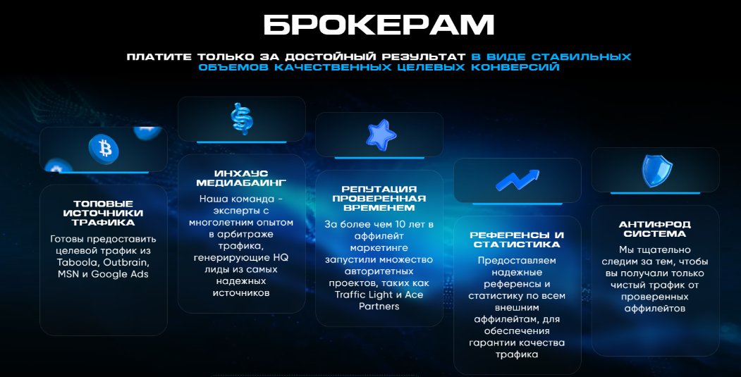 Компания рекламирует себя, как создатель партнерки для вебмастеров Traffic Light и Ace Partners. Уверяют, что теперь разработали уникальную программу для арбитража крипты и монетизации трафика.
