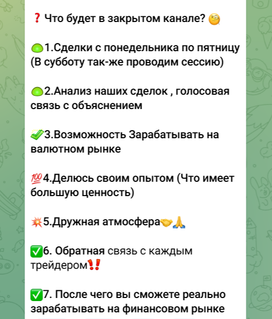 Основной вид заработка — реферальная программа брокера Pocket Option. Автор активно привлекает пользователей в закрытое сообщество, где предлагает следующий контент: