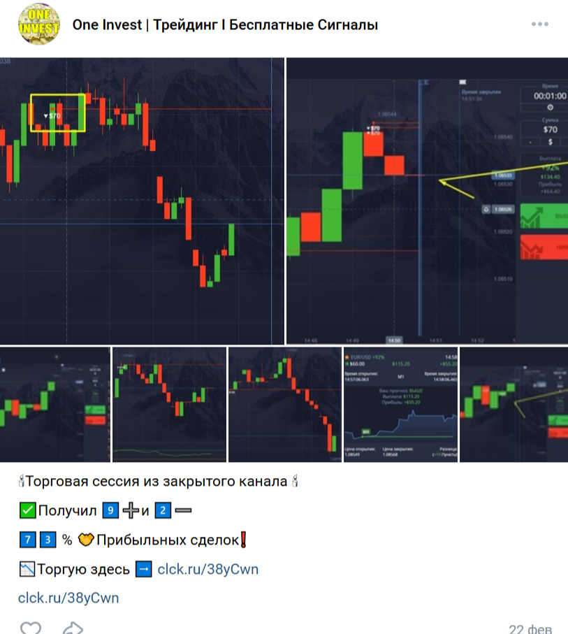 Создатель сообщества в Телеграмме не ограничился одним проектом и создал еще ряд страниц. К примеру, в ВК можно найти группу One Invest Трейдинг Бесплатные Сигналы. На 18 декабря 2024-го к ней подписано около 600 человек. В описании говорится, что сообщество подходит для любителей зарабатывать. Автор дает бесплатные сигналы и обещает заработок с помощью сделок в течение 1-15 минут. Минимальная сумма вложений — от 500 р, а время получения выплат — мгновенно.