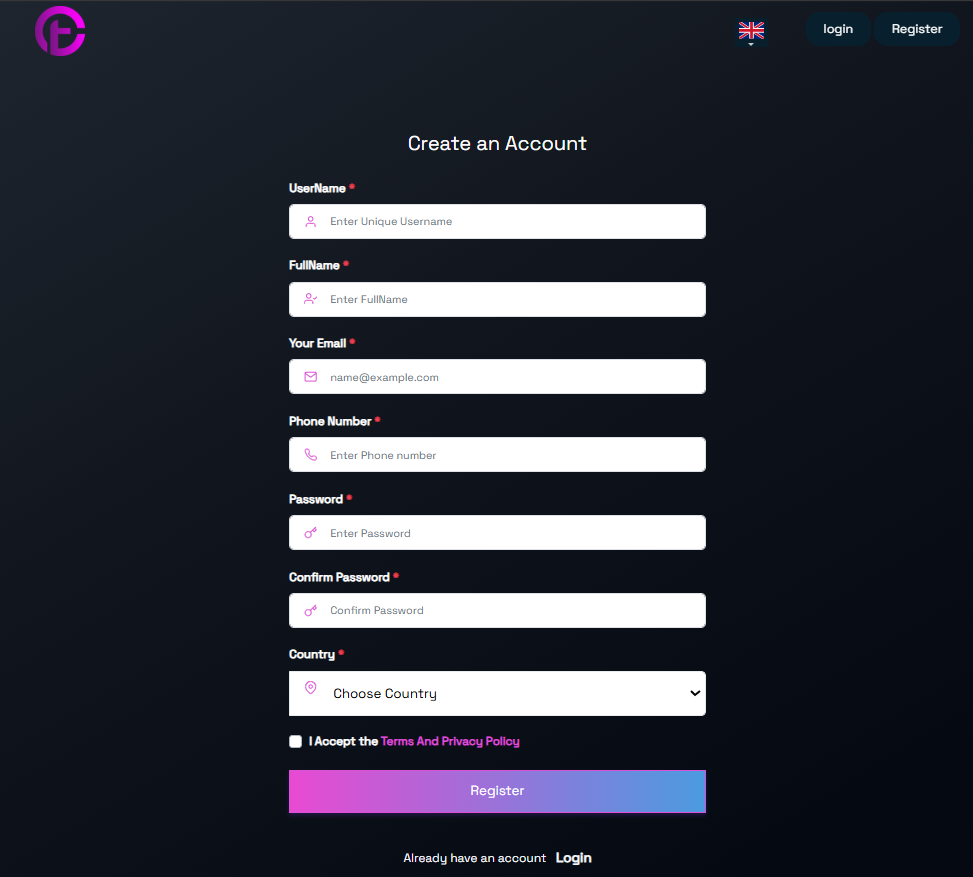 Регистрация представляет собой заполнение стандартизированной анкеты. Трейдеру необходимо указать корректный номер телефона и адрес электронной почты.
