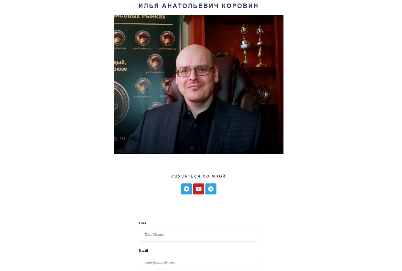 На официальном сайте трейдера можно отправить вопрос или заявку на участие в одном из клубов через форму обратной связи. Стандартных контактов (телефон, электронная почта, адрес организации) на сайте нет.