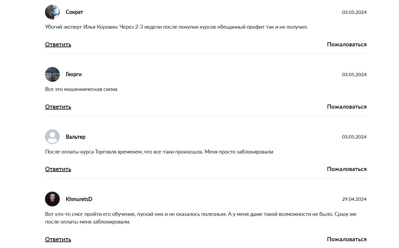 В интернете комментарии о курсе Ильи Коровина Торговля времени и других программах в основном негативные. Пользователи пишут, что не смогли отбить стоимость курса, а некоторые сообщают, что их аккаунты блокируют после оплаты.