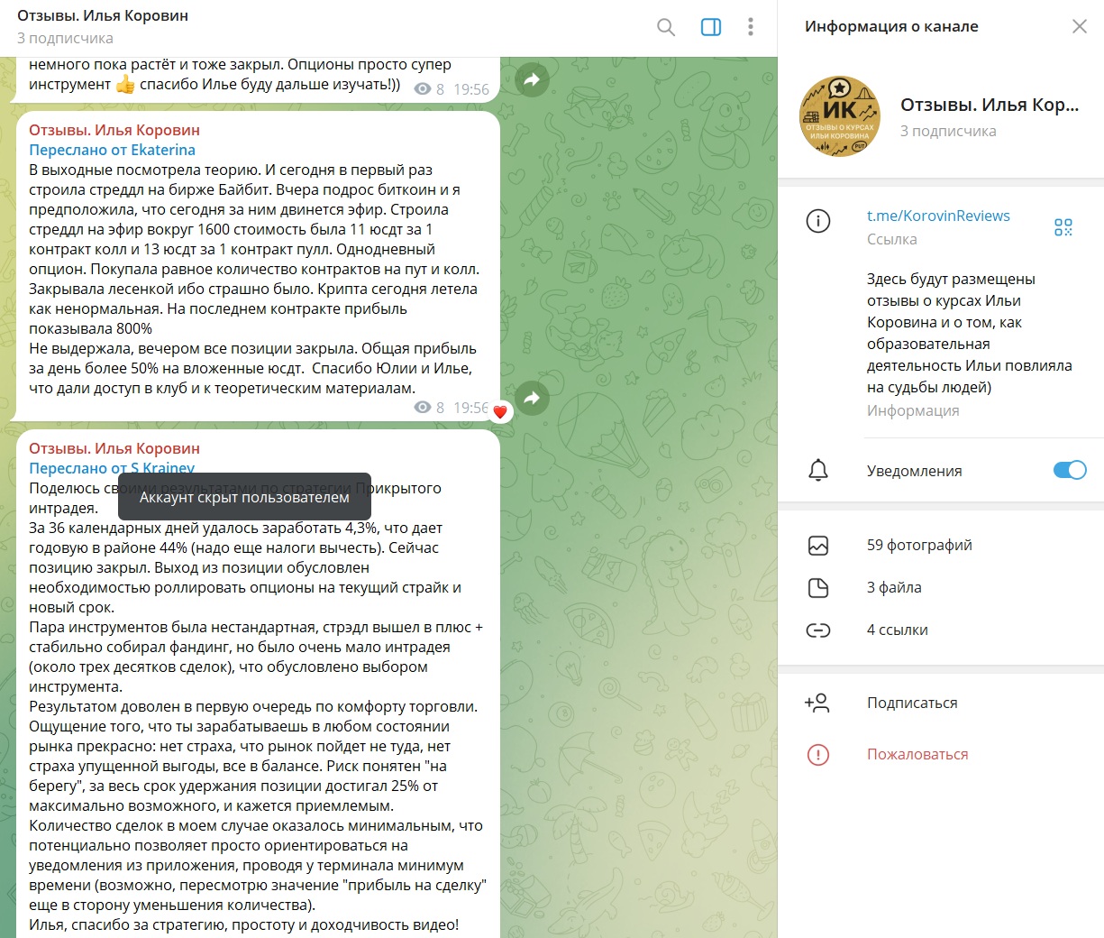 Коровин размещает отзывы своих учеников в специальном ТГ-канале KorovinReviews. При этом на страничку подписано всего 3 пользователя, а все отзывы делаются репостом якобы из личного общения ментора с учениками.