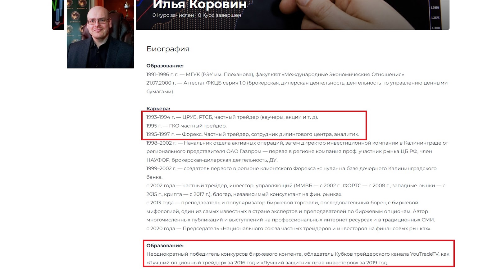 В графе «Образование» указано, что владелец сайта является неоднократным победителем различных биржевых конкурсов и обладателем кубка за лучший трейдерский канал. Что это за кубок – не поясняется, доказательных ссылок на результаты конкурсов также не дается.