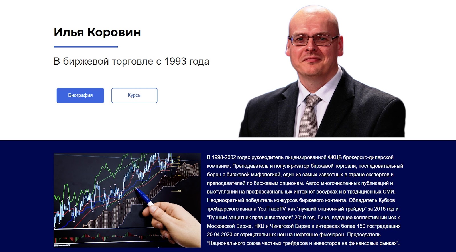 На сайте трейдера ilyakorovin com указано, что Коровин начал работать на биржах в 1993 году. Автор охотно рассказывает о своих заслугах, но упускает целый пласт своей биографии, указывая лишь, что с 1998 по 2002 год он руководил брокерско-дилерской компанией.