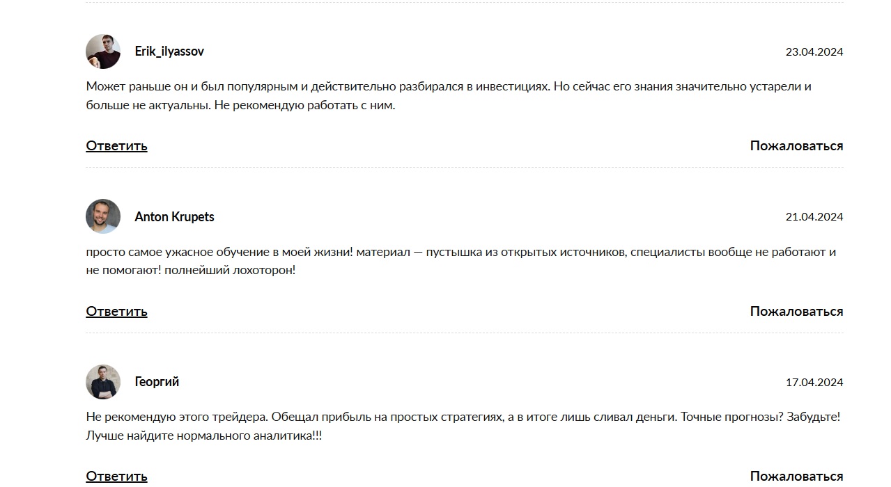 Пользователи сомневаются в экспертности трейдера и отмечают, что он не предоставляет документов. Практикующие трейдеры пишут, что информация в курсах устаревшая и не подходит для реалий современного рынка.
