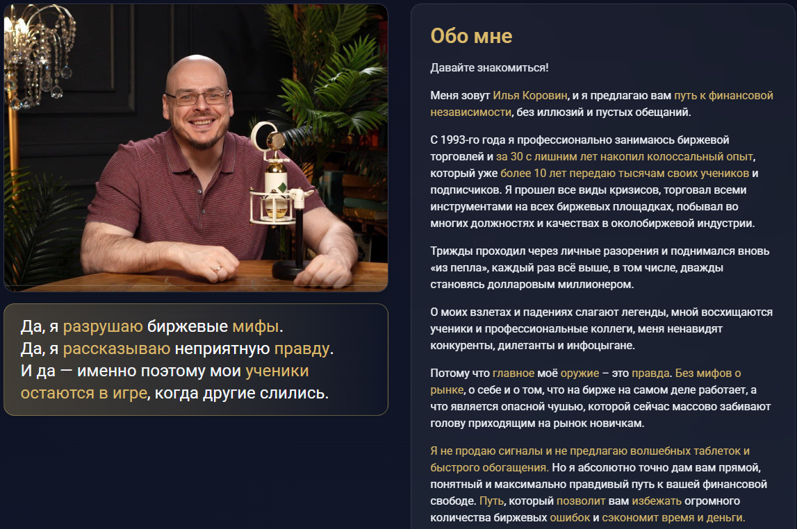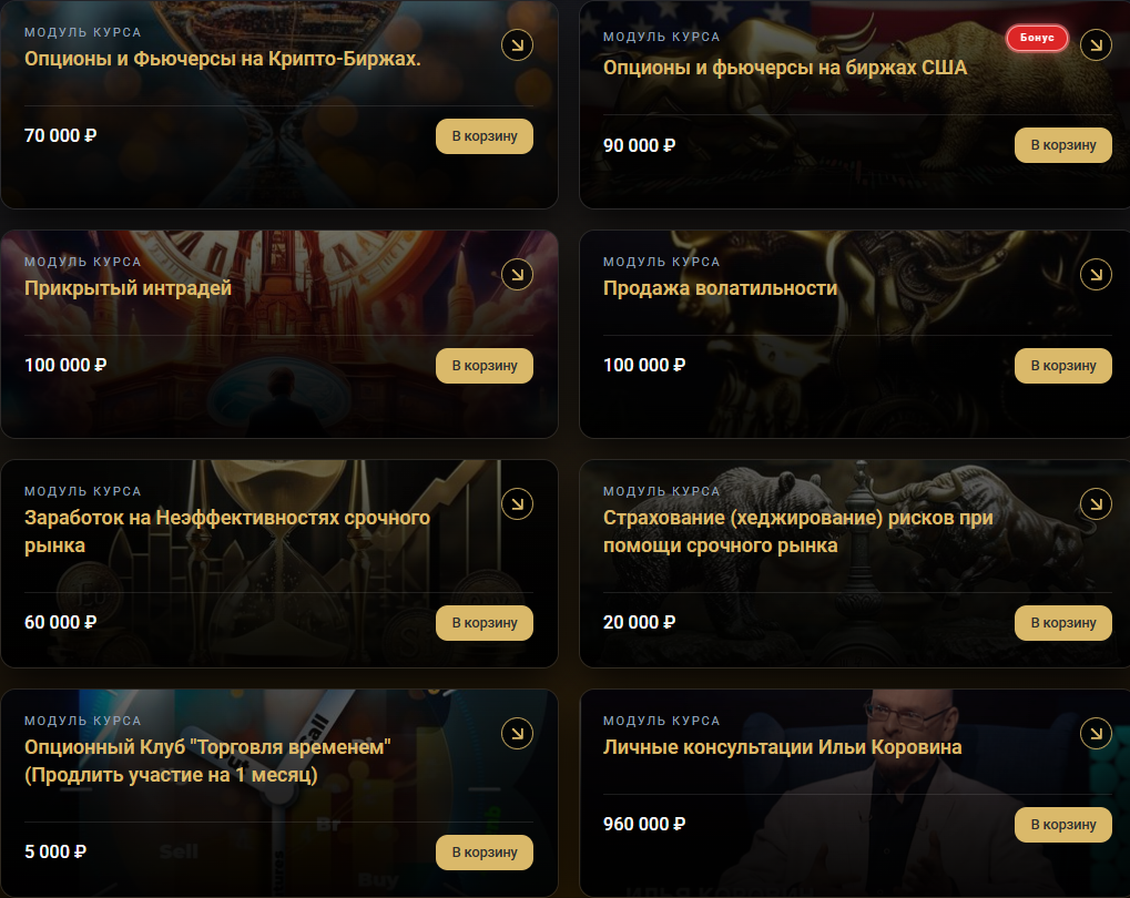 Курс «Опционы и Фьючерсы на Московской Бирже» стоит минимум 70 тысяч рублей вместе с базовым модулем. Программа требует серьезных вложений без гарантий результата. Базовая информация об опционах доступна бесплатно – на сайте Мосбиржи и у брокеров. Отзывы об ilyakorovin com появились только через три года работы проекта, что вызывает вопросы. Проверить торговые достижения автора независимо нельзя.