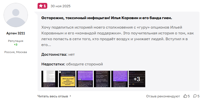 Отзывы об Илье Коровине появились только в октябре 2025-го. До этого их не было, хотя проект работал уже 3 года. На Отзовике несколько развернутых откликов.