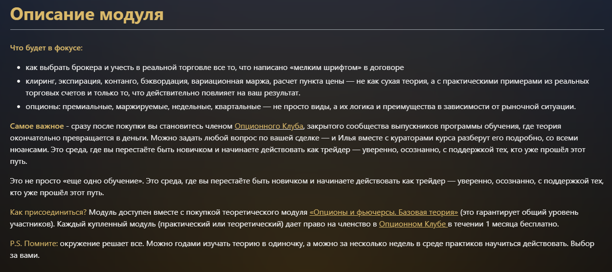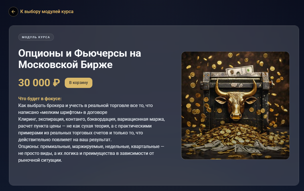 Курс «Опционы и Фьючерсы на Московской Бирже» нельзя купить отдельно. Сначала нужен базовый курс за 40 тысяч рублей. Итого минимум 70 000. После оплаты дают доступ к материалам навсегда. Программа охватывает такие темы: