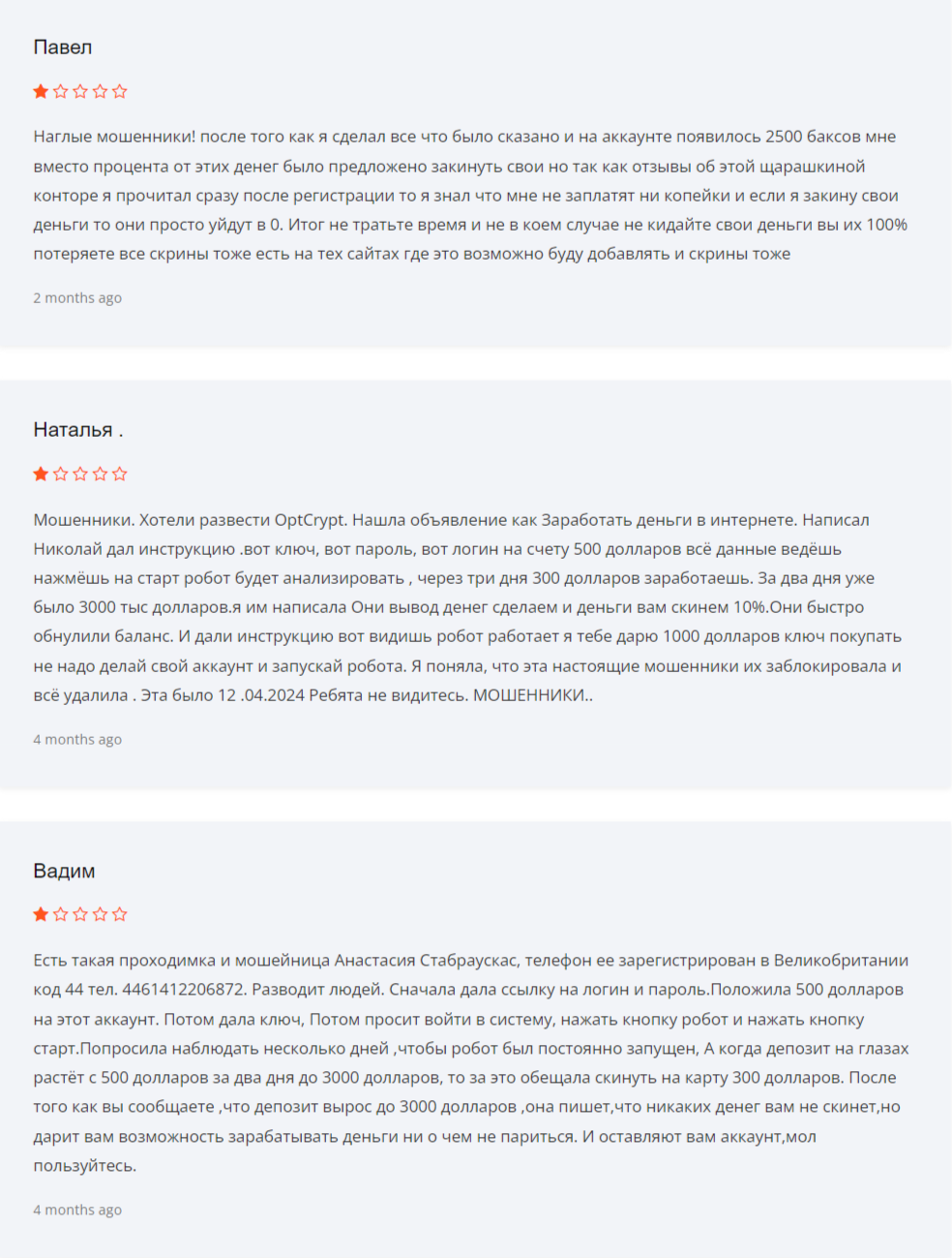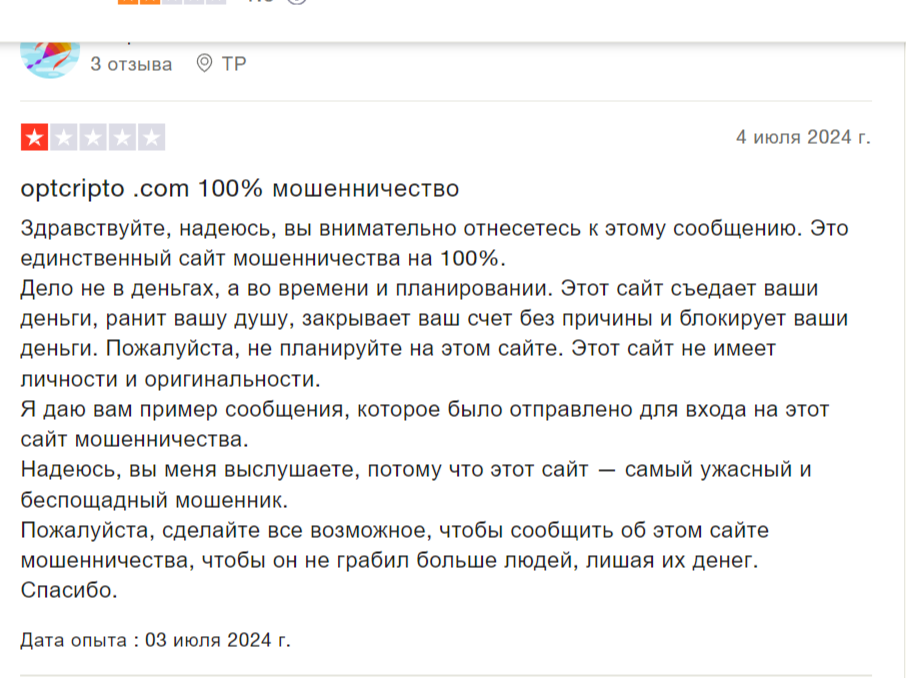 В отзывах о компании многие клиенты отмечают, что Optcrypt Com — лохотрон. Трейдеры жалуются, что многие заявления являются ложью и не соответствуют действительности. Кроме того, представители компании используют множество схем мошенничества для развода пользователей. Все до одного утверждают, что потеряли деньги, а представители посредника — мошенники.