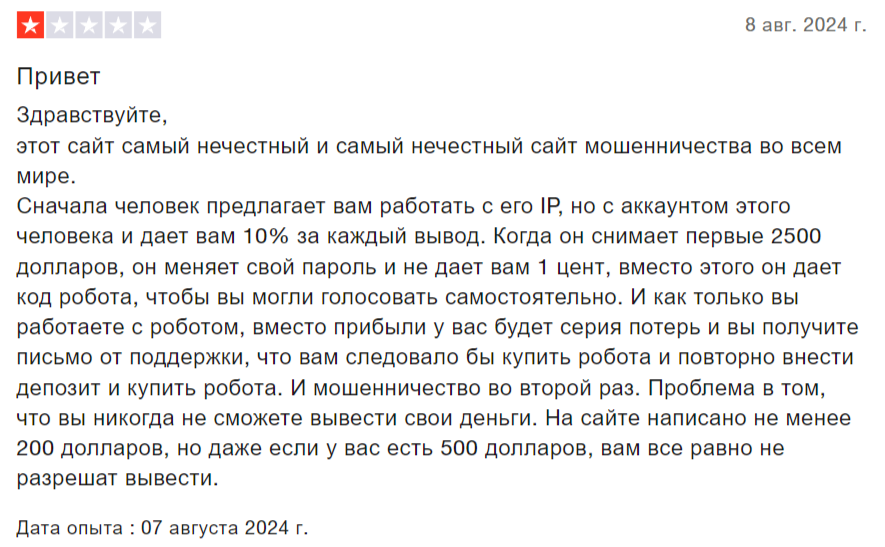 Чем дольше работает лохотрон, тем больше негативных комментариев появляется в интернете. После регистрации пользователи ничего не зарабатывают, а в большинстве случаев не могут вернуть деньги.