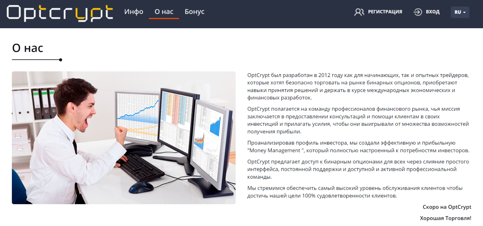 Главные сведения о посреднике приводятся на официальном сайте Optcrypt Com. Здесь доступна форма регистрации, кратко описываются услуги и бонусы для пользователей.