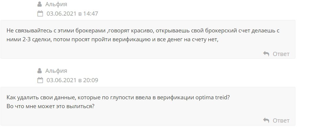 Просмотрев отзывы реальных людей об Оптима Трейд на различных информационных площадках и форумах, были обнаружены десятки отрицательных откликов о проекте. Пользователи не могут вывести свои средства с платформы, на что поддержка лишь ежедневно отправляет идентичные тексты с пустыми обещаниями.