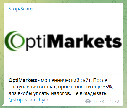 Мониторинговые ресурсы отмечают низкие оценки и предупреждения: рядом агрегаторов ОптиМаркетс получает низкие баллы за прозрачность и доверие, а на специализированных сайтах появляются жалобы на проблемы с выводом и навязывание доплат. Это согласуется с типичной картиной, когда проект активно рекламируется, но независимых подтвержденных кейсов успешного вывода средств немного или они отсутствуют.