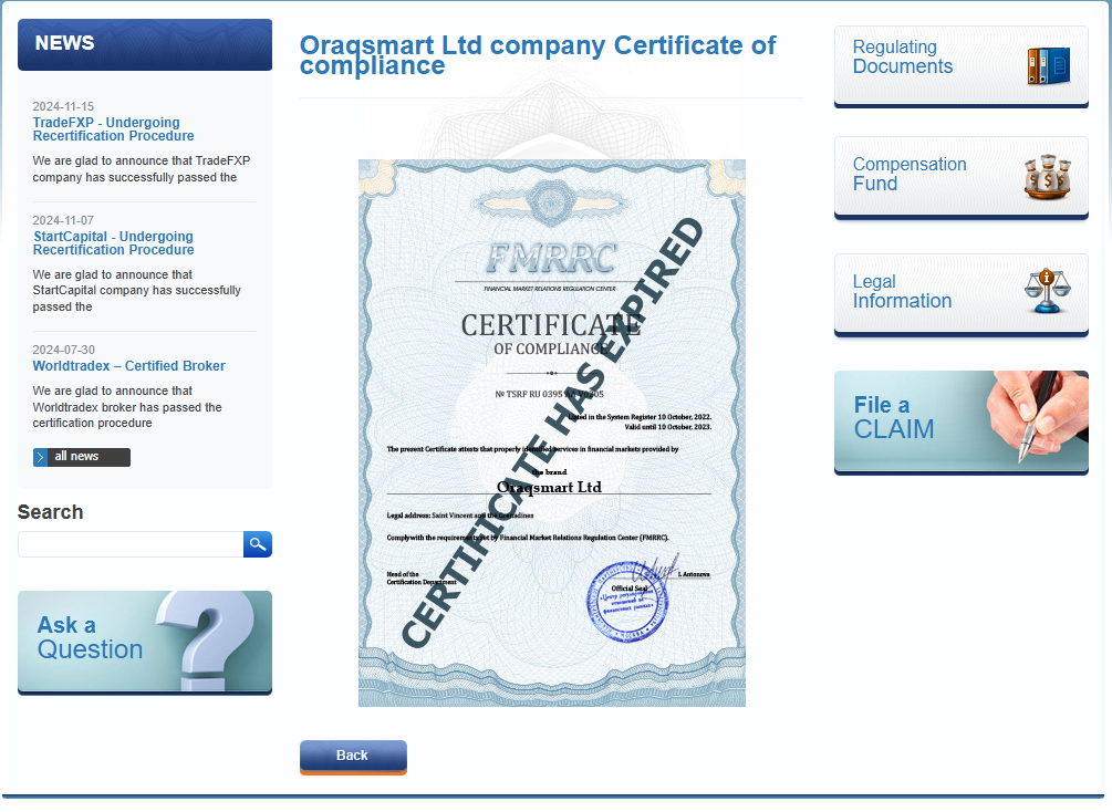 Известна и компания, стоящая за брокером. Это Oraqsmart Ltd и найти ее можно в реестрах ЦБ РФ и IFMRRC. Однако в первом случае указаны признаки нелегальной деятельности, а во втором случае лицензия была аннулирована.