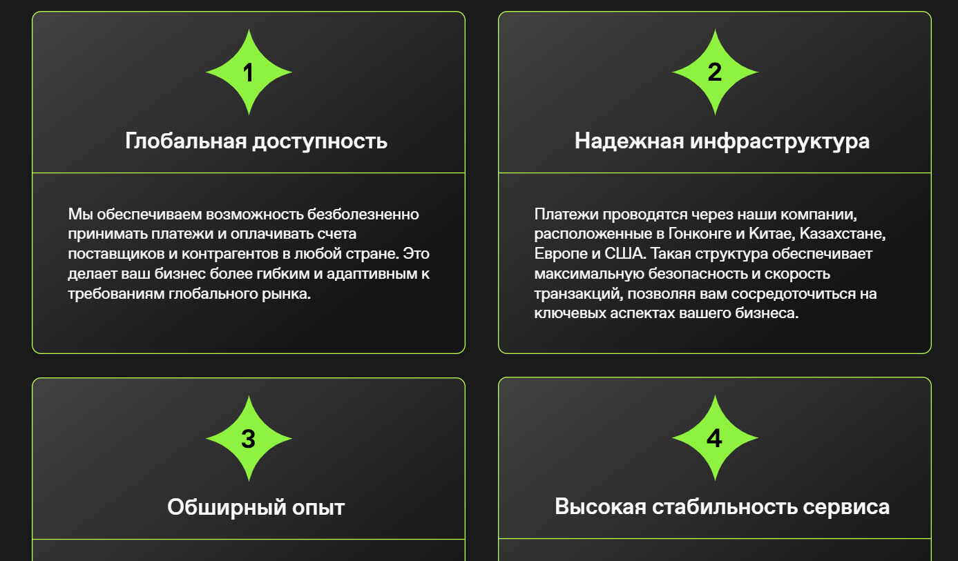 - Надёжная инфраструктура – платежи проводятся через дочерние предприятия по всему миру.