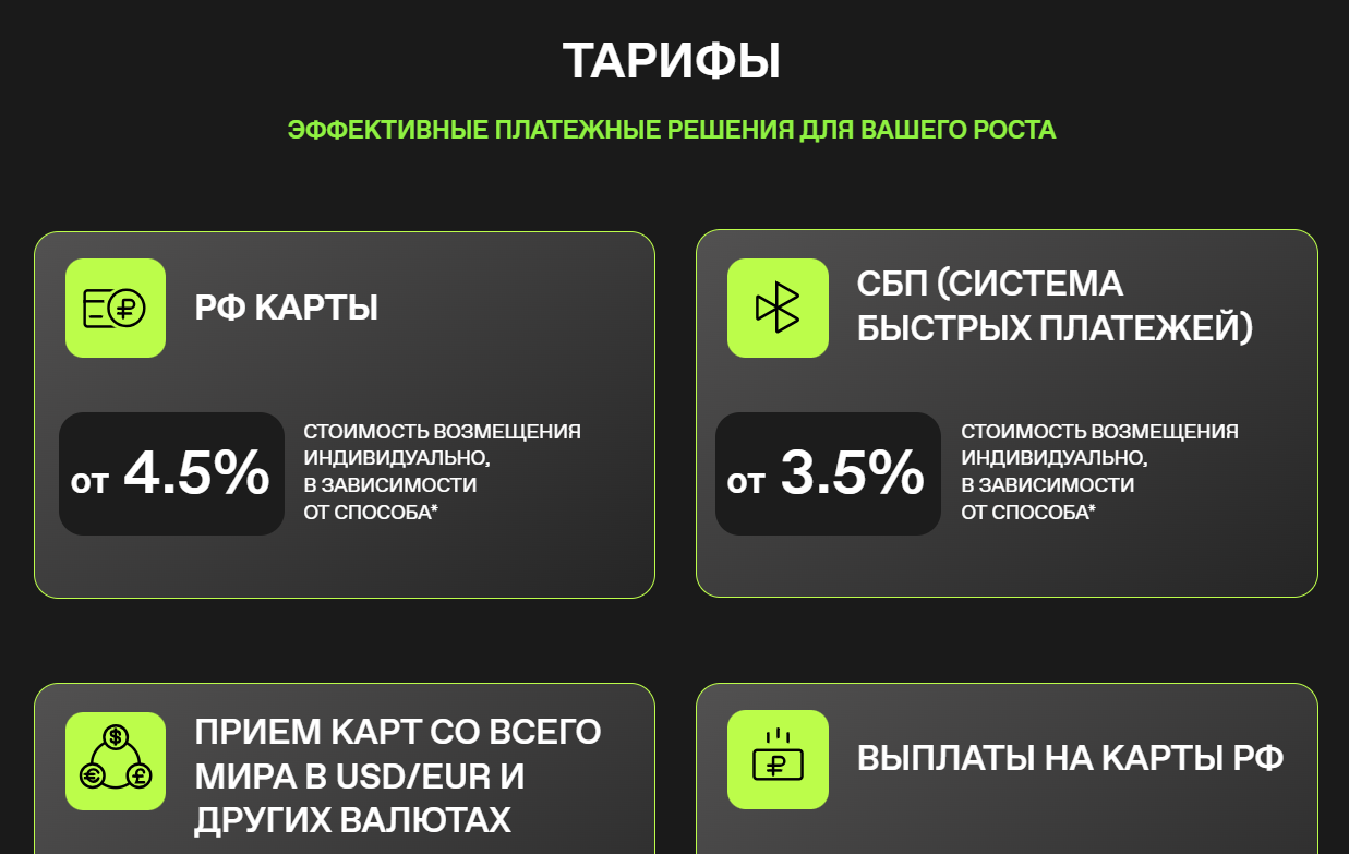 - возможность совместить в одной интеграции любые платежные методы, будь то российские и зарубежные карты, СБП, криптовалюта или расчётные счета;