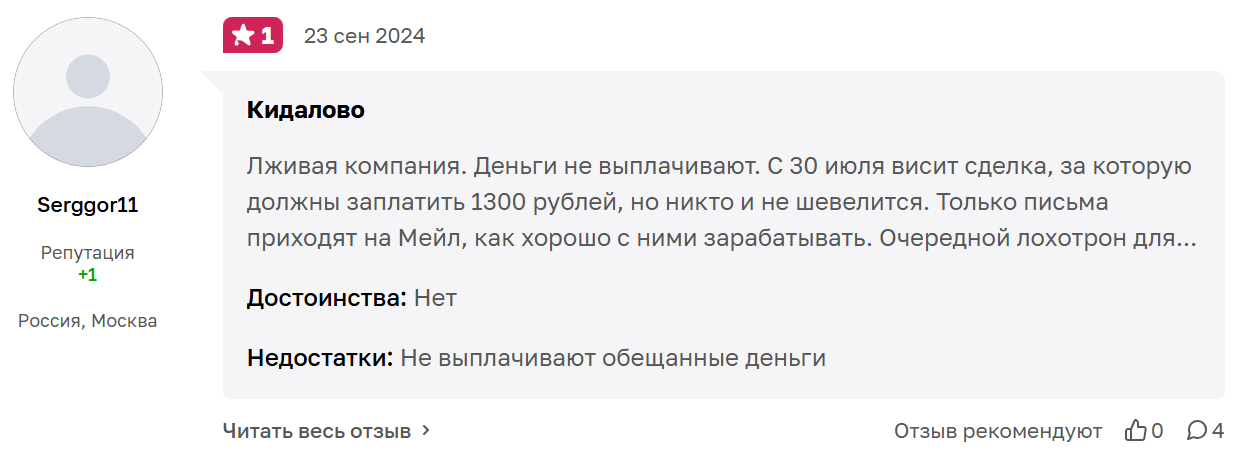 Здесь же есть несколько негативных отзывов. Площадка строго наказывает за совершенную ошибку, лишая заработанных денег и не помогая исправить погрешность.