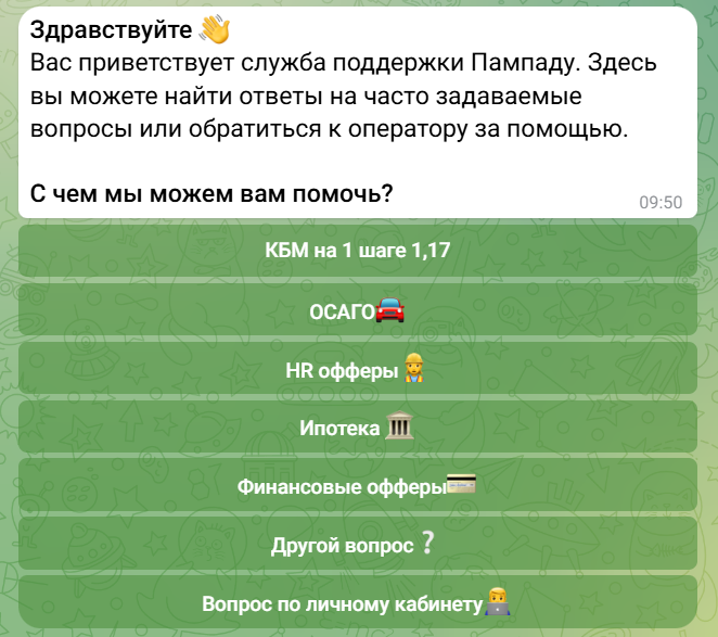Для разбора ситуации пользователя представлены готовые категории, также есть возможность задать свой вопрос. Если же бот не смог ответить на запрос пользователя или клиент считает, что он получил неверный ответ, то можно написать слово “Оператор” и подключиться к живому специалисту.