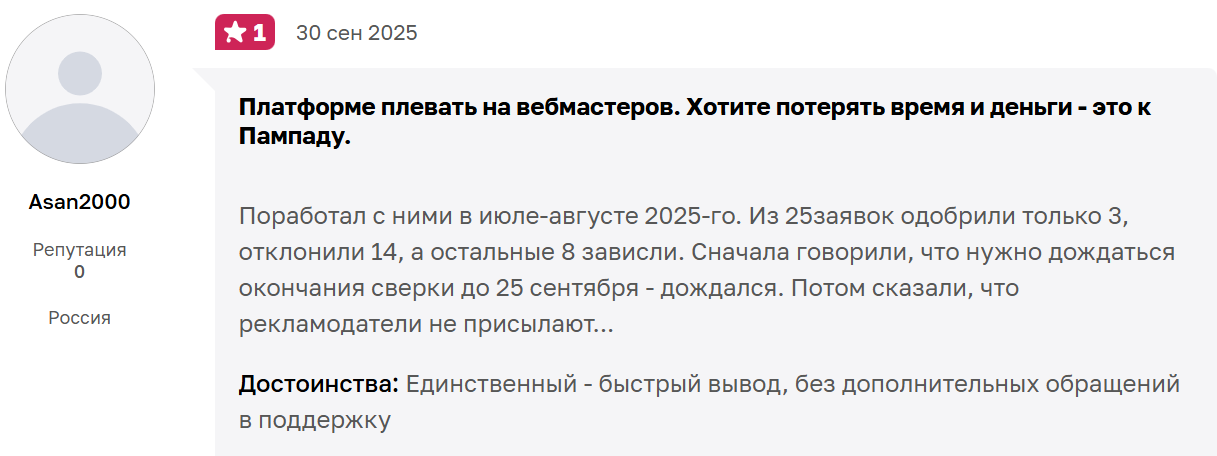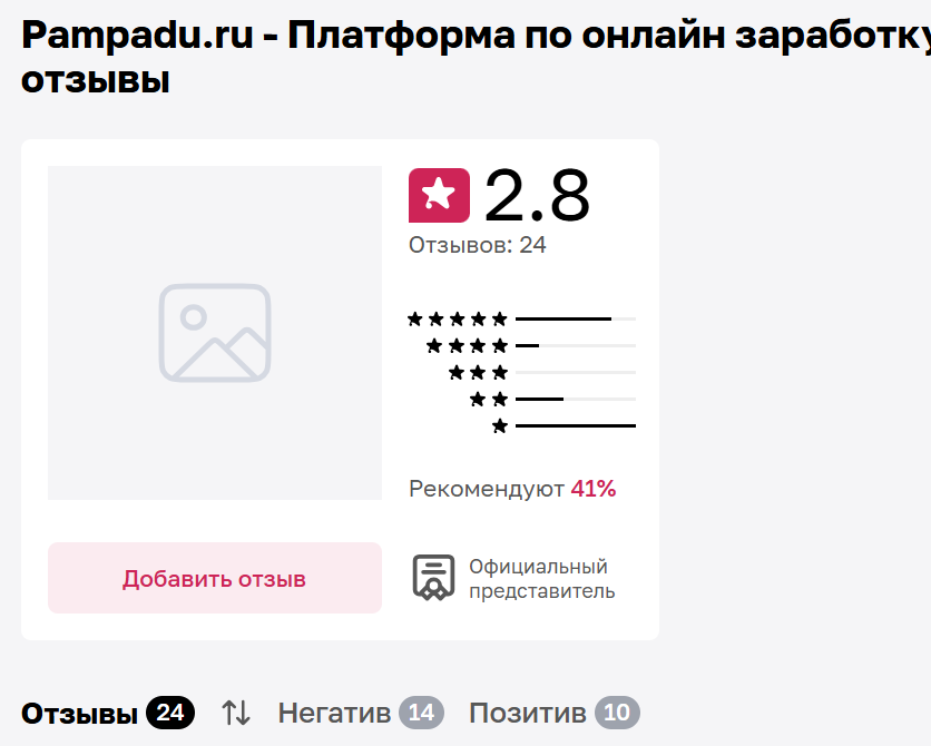 Платформа Отзовик стала самой богатой на отзывы пользователей о Пампаду. Негативных мнений здесь немного больше, чем положительных. В жалобах пользователи преимущественно отмечают скромные суммы вознаграждений, а также длительные задержки выплат.