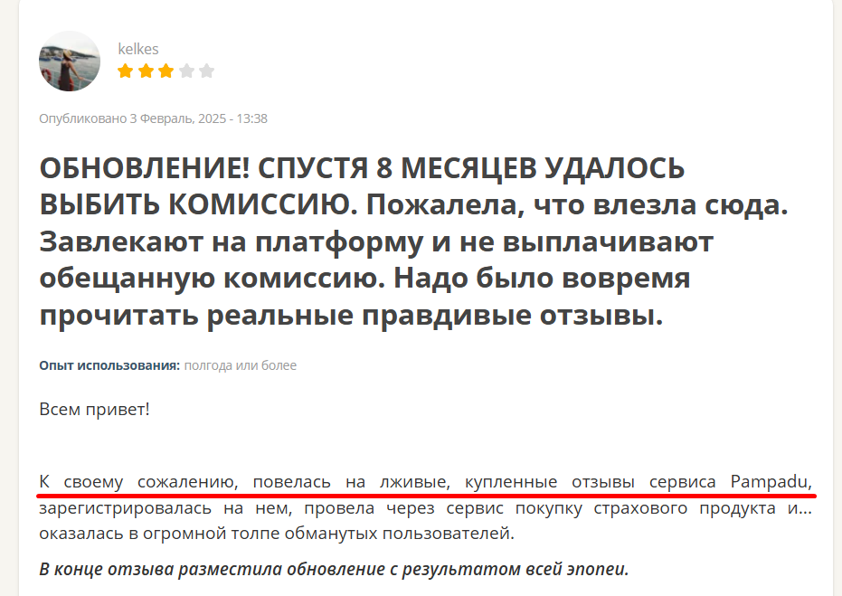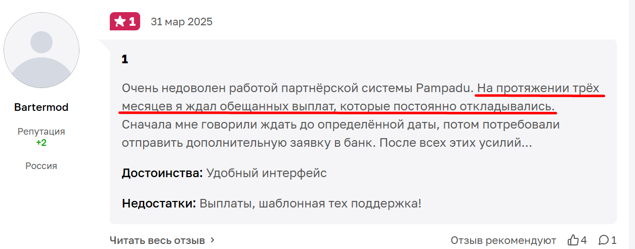 Некоторым работникам деньги не выводят спустя почти 4 месяца, другие же смогли “выбить” свою комиссию по прошествии 8 месяцев. Также разочарованные сотрудники сервиса отмечают наличие фальшивых отзывов о Pampadu ru, которые стали причиной их решения присоединиться к компании.