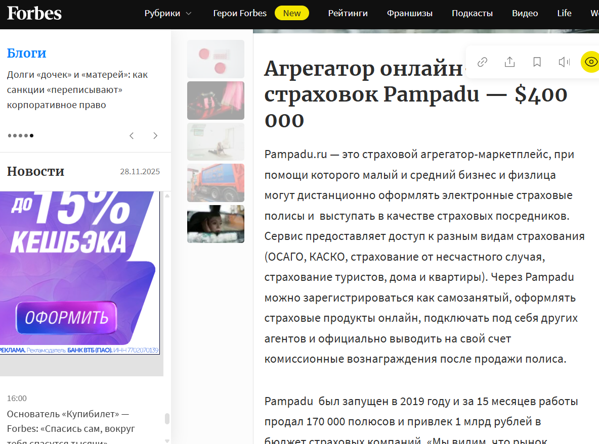 На сайте представлен образовательный блок с собственными статьями проекта, а также перечень ссылок на другие издания. К примеру в 2020 году Forbes освятил деятельность Пампаду как агрегатора онлайн-страховок, который за 15 месяцев работы продал 170 000 полисов и увеличил приток денег в страховые компании на 1 млрд. руб.