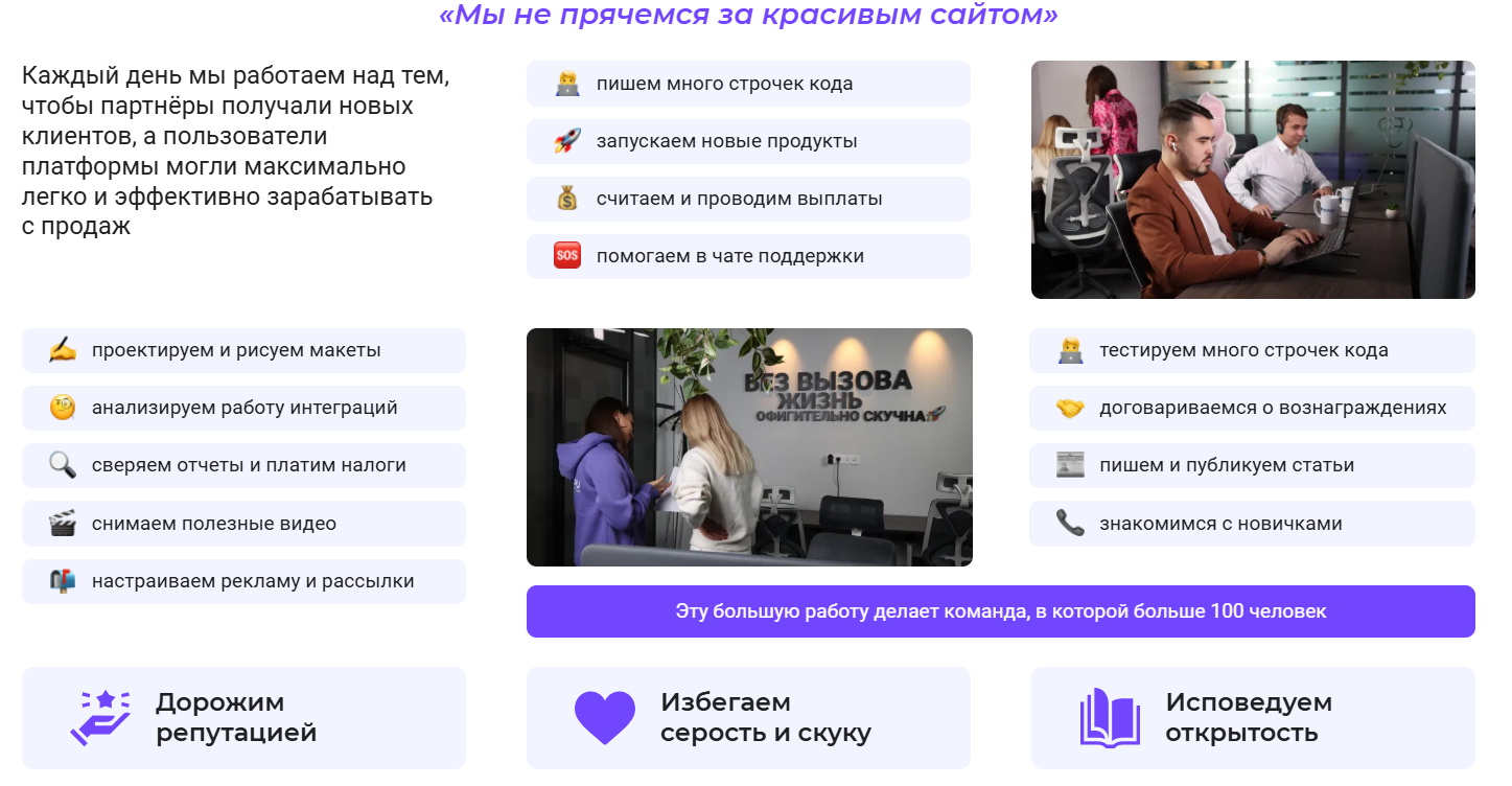 На сайте сервиса партнерских продаж Pampadu ru презендутся детали работы команды, которая включает более 100 человек. Среди обязанностей специалистов Пампаду – проектирование и отрисовка макетов, анализ работы интеграции, настройка рекламы и рассылок, запуск новых предложений, и т.д.