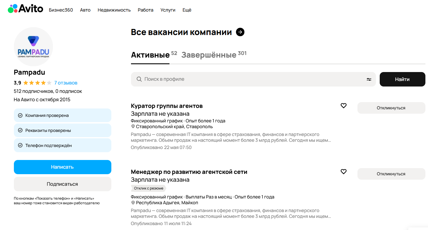 Брокер Пампаду привлекает партнеров в том числе через объявления на Avito. На момент написания здесь представлено 52 активные вакансии менеджера по развитию агентской сети.