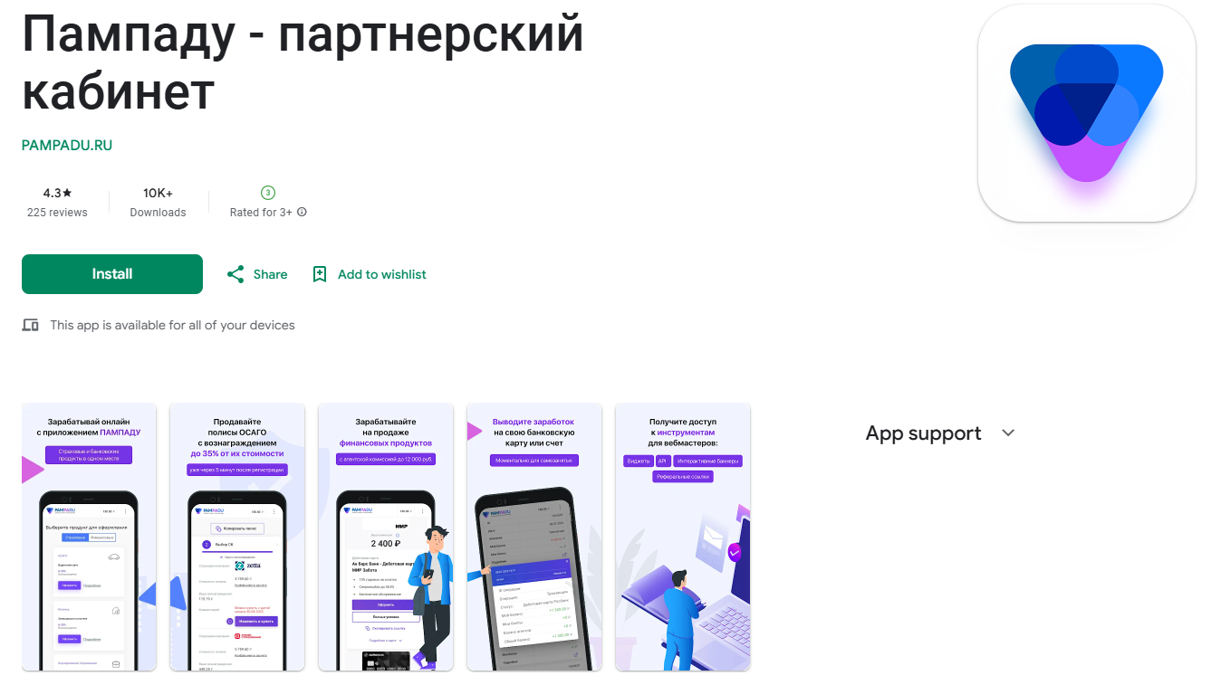 Партнерский кабинет Пампаду можно установить на свой гаджет, скачав мобильное приложение с платформ популярных цифровых магазинов.