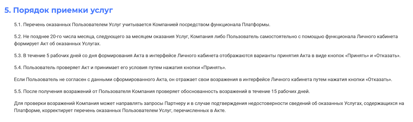 Согласно пунктам договора оферты, акт об оказанных услугах формируется не позднее 20 числа месяца, следующего за месяцем оказания услуг. Варианты принятия акта отображаются в личном кабинете пользователя в течение 5 дней со дня формирования электронного документа. Пользователь может выбрать опцию “Отказать”, если не согласен с итогом своей работы.