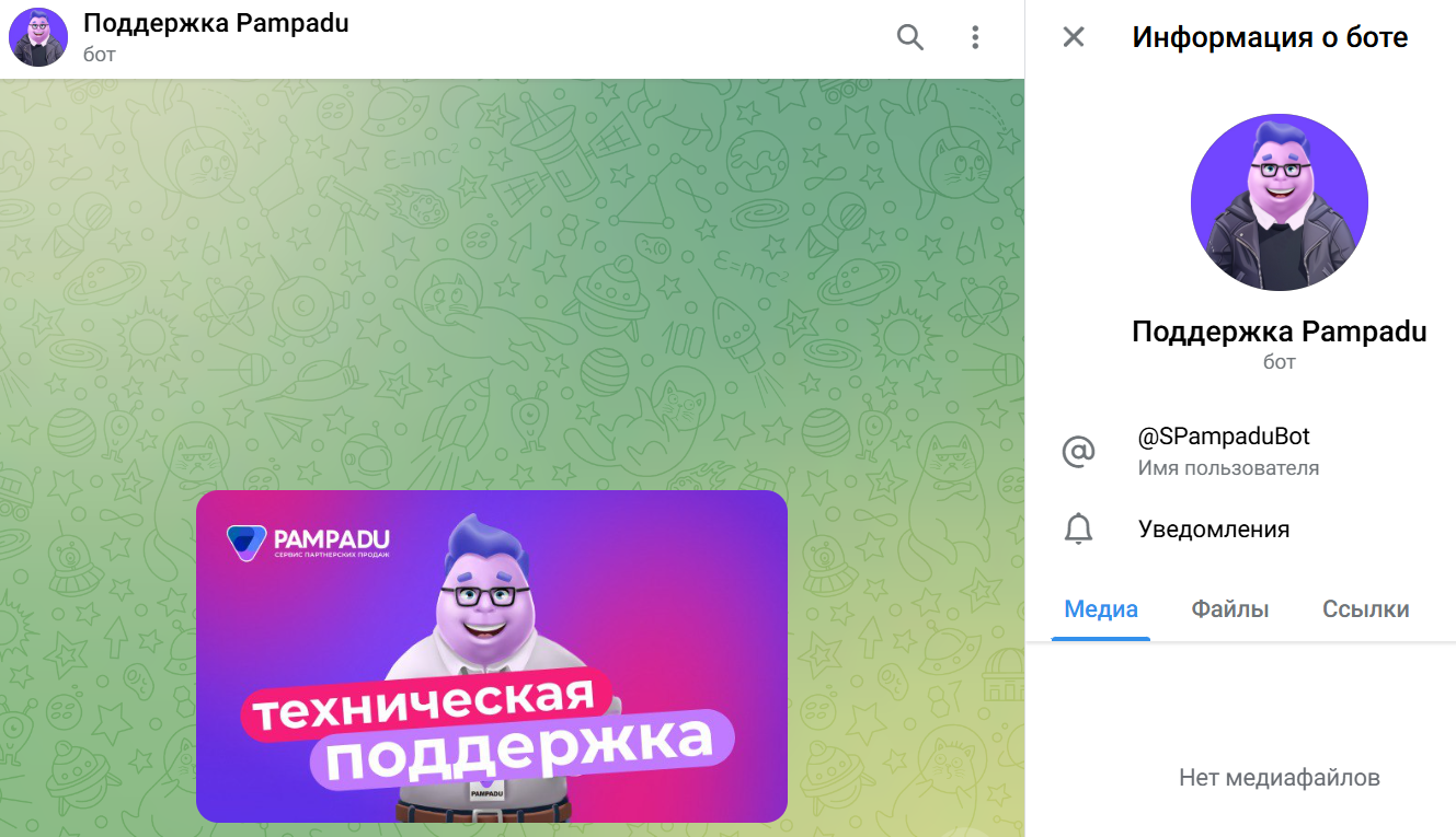 - поддержка работает через ТГ бот Пампаду и электронную почту;