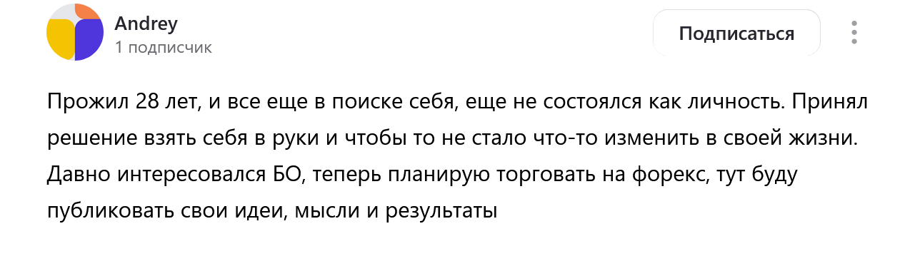 На канале «Яндекс Дзен» сделана всего одна запись: там автор называет себя Андреем. Он заявляет, что заинтересовался БО, то есть бинарными опционами, а затем начал торговать на «Форекс».