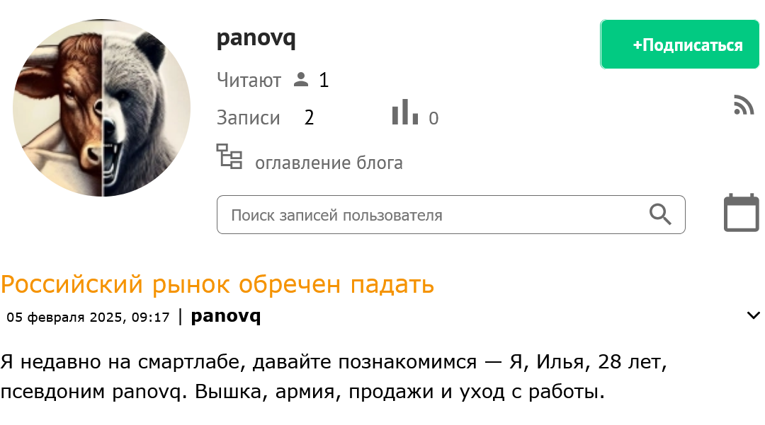 На Panovq Smartlab автор пишет примерно то же самое, но называет себя Ильей. Он сообщает, что отслужил в армии, окончил вуз, а в 28 лет бросил работу ради торгов на бирже. Блог обновляется регулярно: последняя запись сделана 5 февраля 2025 года, его читает и комментирует 2 человека.