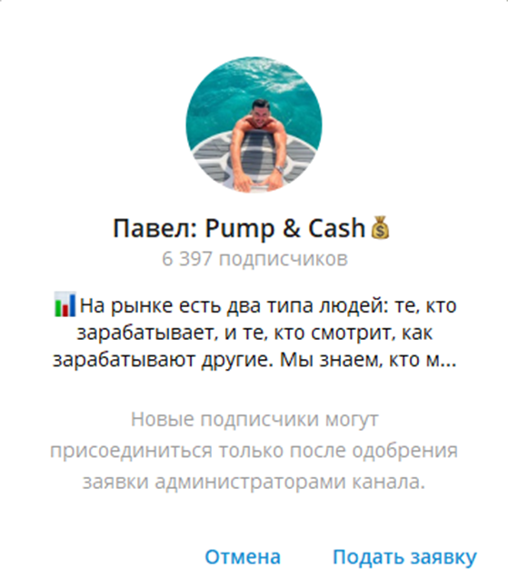 «Павел Pump Cash» – это закрытый телеграм-канал от трейдера, который утверждает, что безбедно живет на заработок от трейдинга. Этот человек готов делиться своим опытом, но для доступа нужно подать заявку и получить одобрение администратора. Рассмотрим деятельность этого участника рынка и проанализируем имеющуюся информацию.
