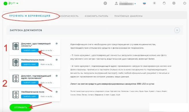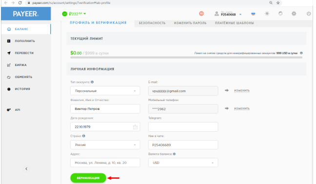 Чтобы верифицировать личные данные надо в разделе «Профиль» заполнить форму payeer account verification.