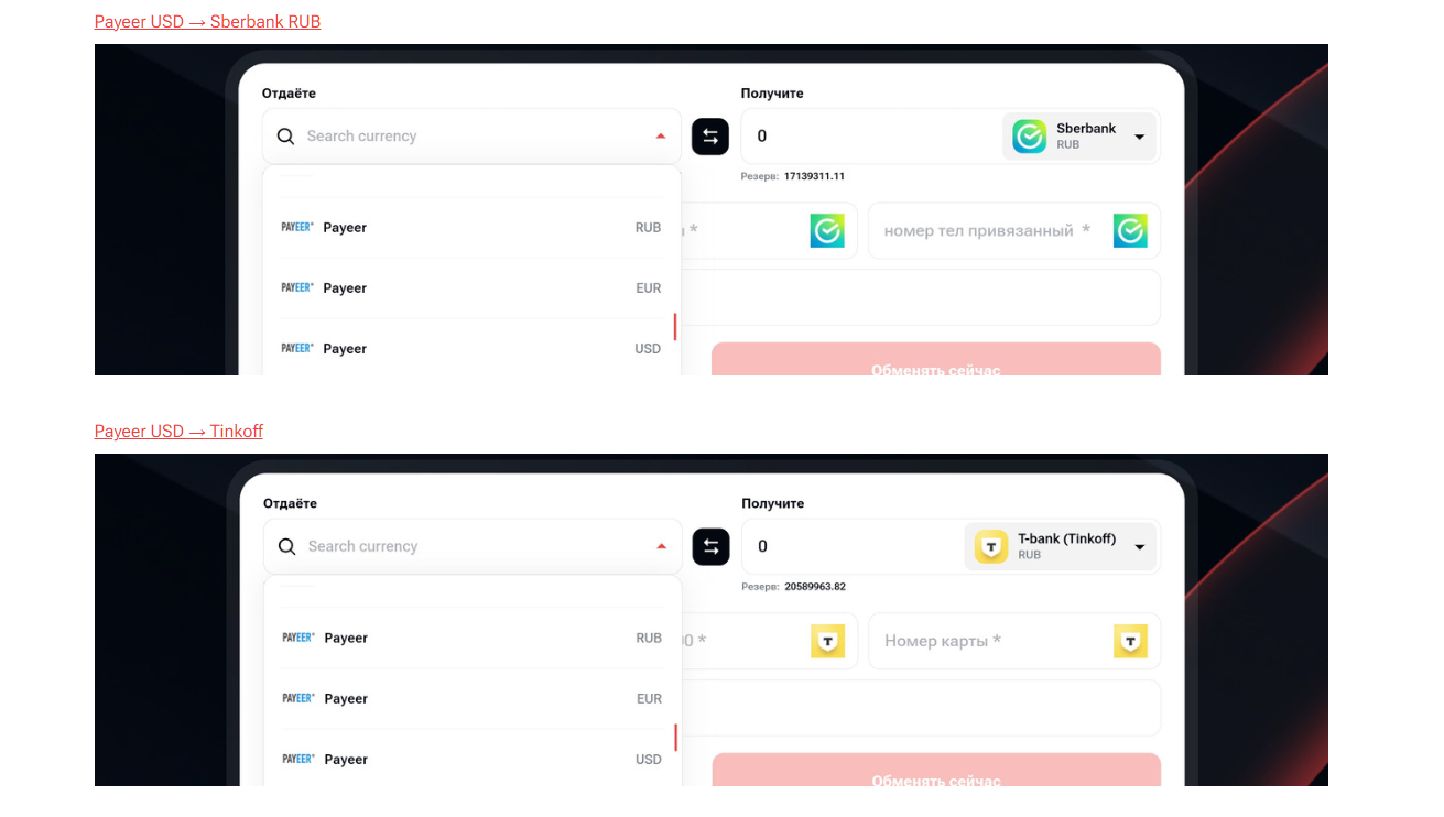 - выбираем направление обмена. Переходим на сайт обменника и задаем направление, например, Payeer USD → Сбербанк RUB;