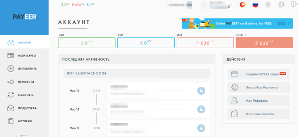 В правой части страницы личного кабинета Payeer расположены следующие разделы: