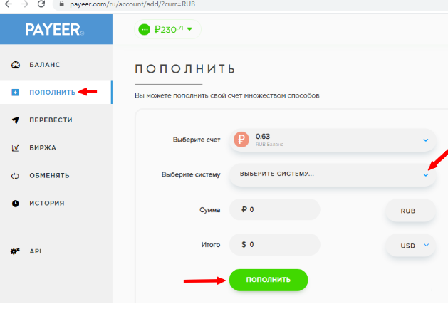 Можно пополнить счет разделе «Баланс», где содержится информация о поддерживаемых сервисом валютах и их текущем состоянии. Существует несколько способов как пополнить электронный кошелек Payeer в России: