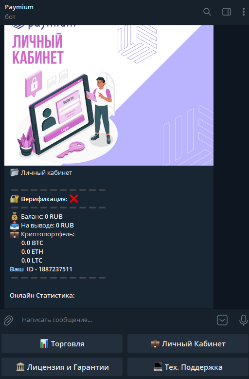 Работать на платформе можно через Телеграм бота Paymium Finance Bot. На его основе реализован полноценный терминал и личный кабинет, в котором можно совершать все сделки. Через него же можно связаться с технической поддержкой.