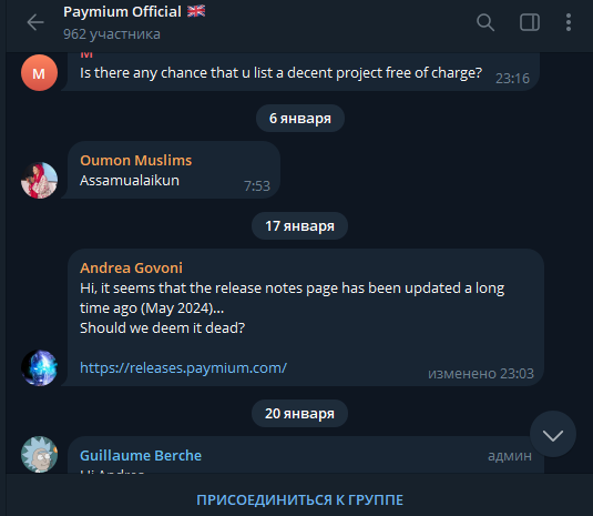 Помимо сайта и бота, есть канал и чат в Телеграмме. Канал Blockchain io является практически пустым, подписчиков в Paymium на март 2025 года здесь только чуть более 40 человек. Последняя активность была в мае 2022 года.