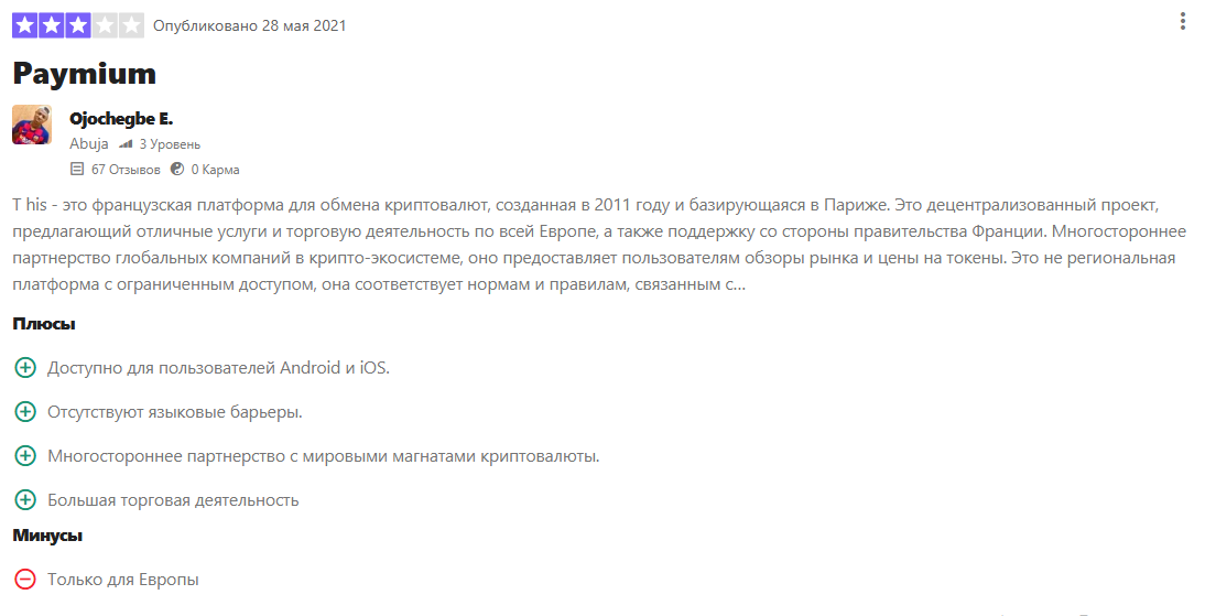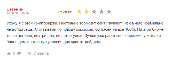 В открытых источниках можно найти негативные комментарии о данном проекте. Люди говорят о том, что сайт постоянно тормозит и из-за этого бывают проблемы с торговлей. Также, в отзывах о боте Paymium люди отмечают то, что сотрудничество целесообразно только для пользователей из Европы. Если пользователь будет из другой страны, то сотрудничество будет затруднено.