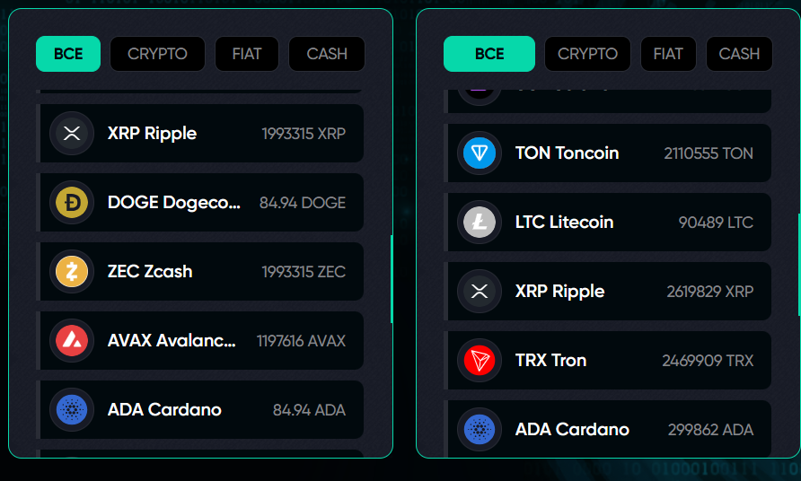 На сайте платформы пользователей встречает большой баннер с видами криптовалюты и монет для перевода. Среди них расположены одни из самых популярных активов, например Trx, Btc, Eth и другие.