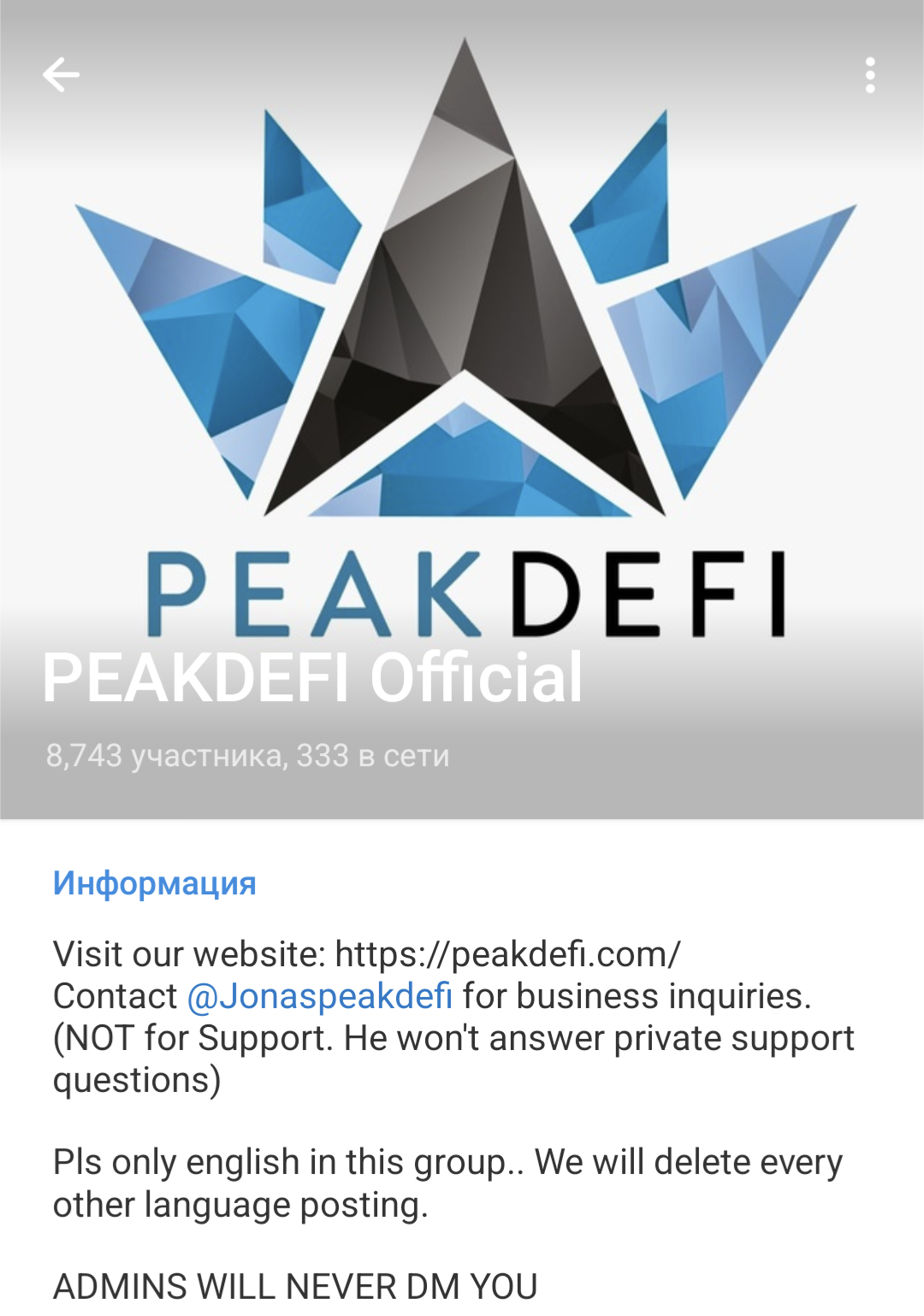 За пределами сервиса сформирована экосистема, включающая в себя немало страниц и каналов на разных платформах, включая Telegram (Peakdefi Official), социальную сеть X (Peakdefi). Правда, ни один из них не представляет серьезной ценности, ведь активность проявляется редко, а чаще всего можно заметить более чем недельные простои в общении между подписчиками и публикациями анонсов или новостей.