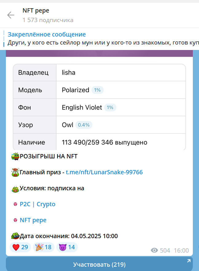 На канале с адресом NftMarkeeet, где продают Nft последний пост про лягушку «Нфт Пепе» в Телеграмм выложен 4 мая 2025 года, но перед этим видно, что многие подарки были куплены. Здесь 166 подписчиков, а публикации иногда просматривают более 200 пользователей, но комментарии отключены.
